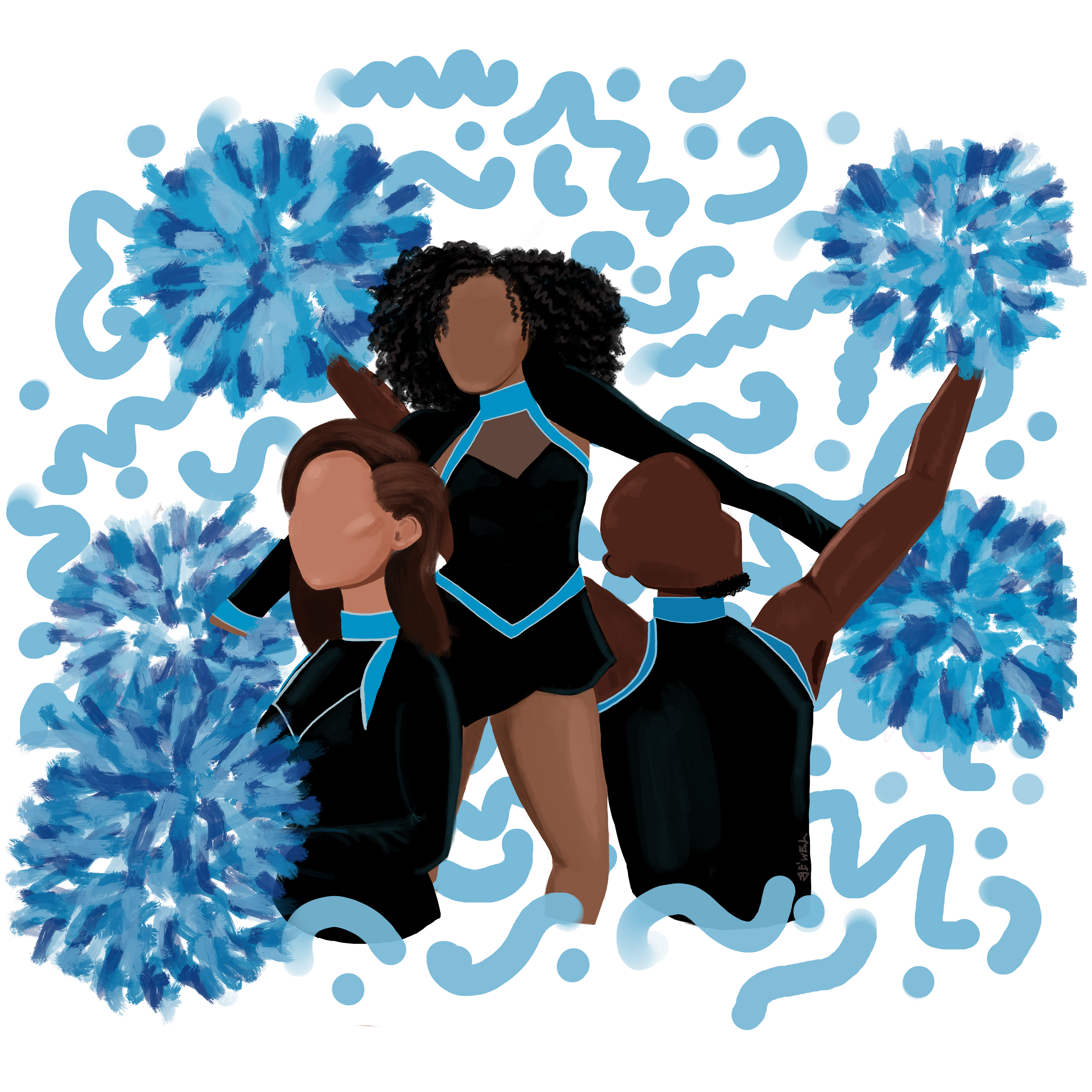 The Process: Using Procreate, I decided on a simple color palette using the Carolina Panthers brand colors. In a painterly style, I composed a group of faceless individuals poised for cheer and celebration against my signature abstract pattern.