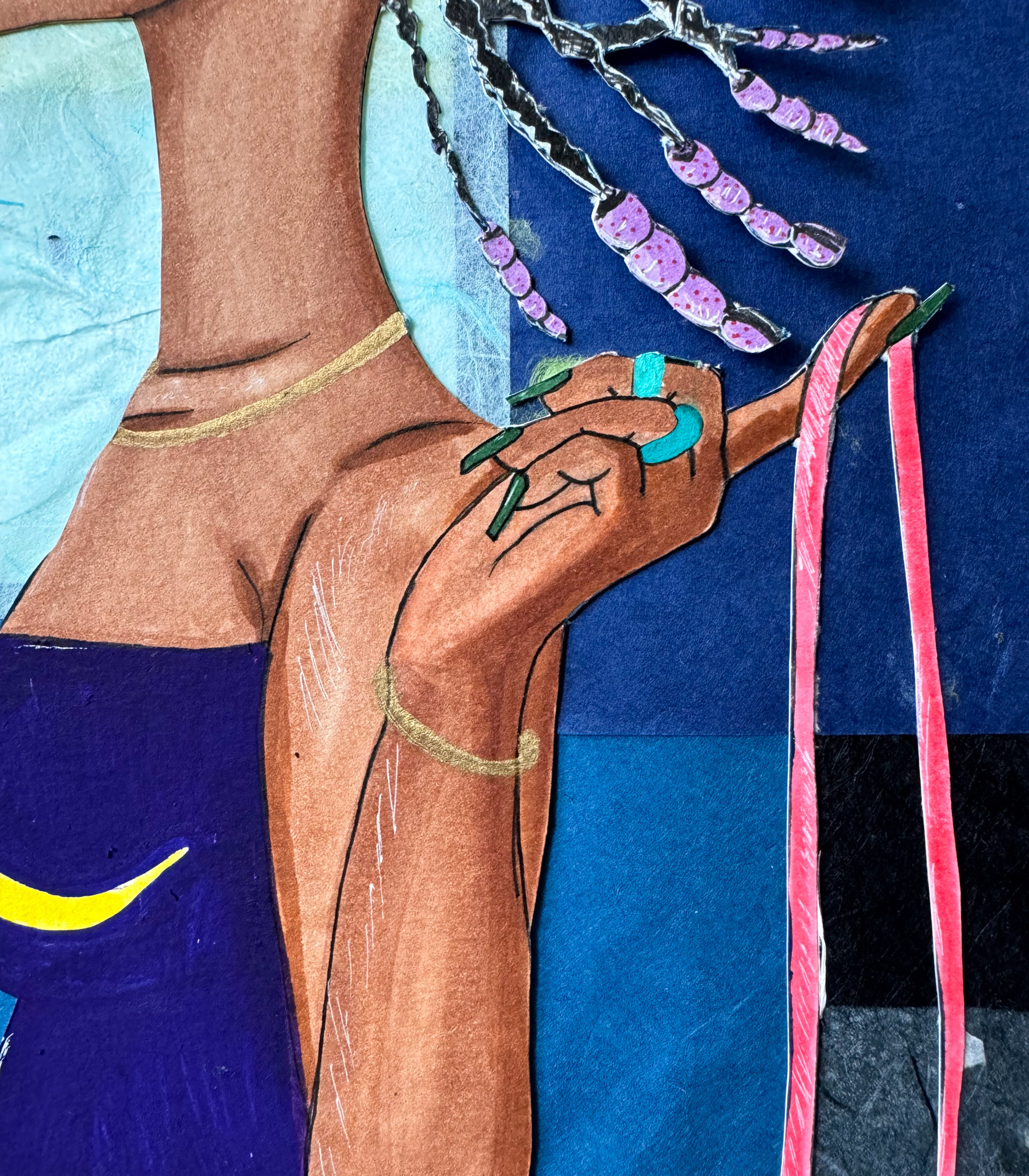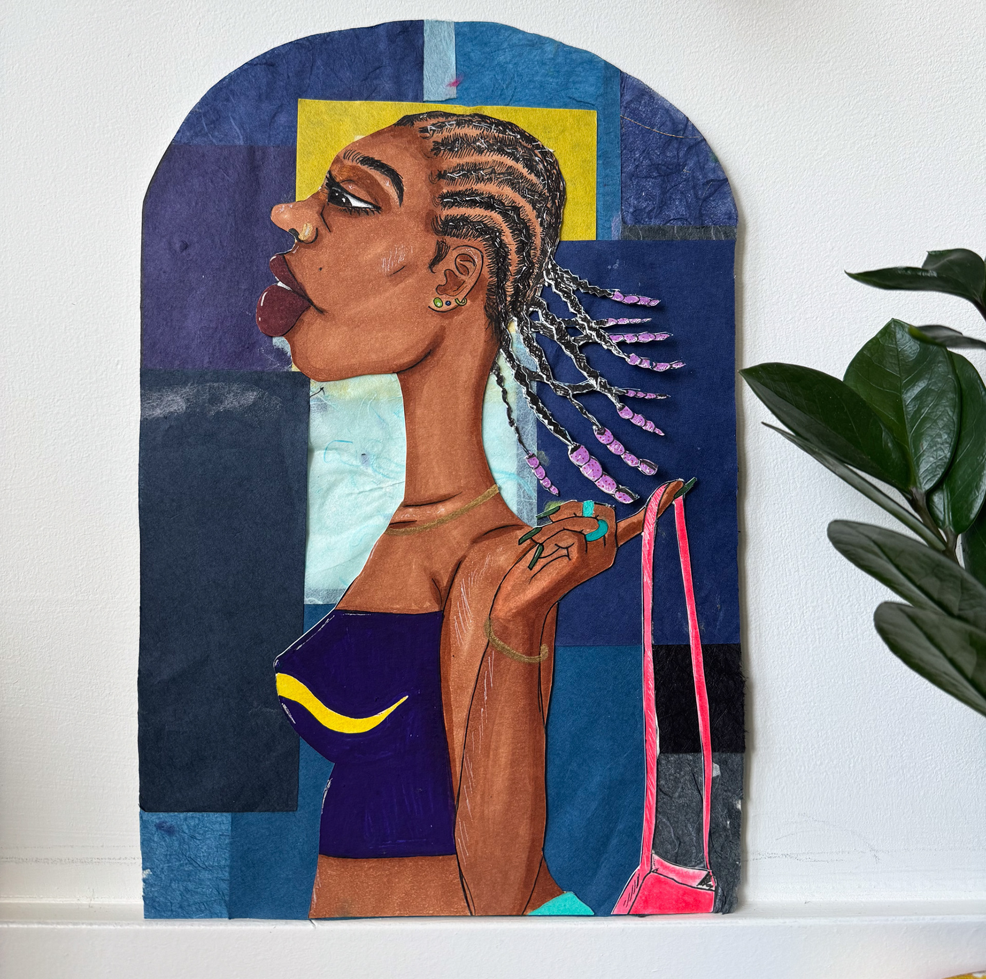 Hold My Purse displays the beautiful balance of masculine and feminine energies within Black women. This composition challenges the "Angry Black Woman" trope by validating her emotions, no matter how uncomfortable some people may be. The mixed media approach of this work speaks to the varied experiences that Black women have with self-expression as it relates to race and gender despite the collective understanding that persists.